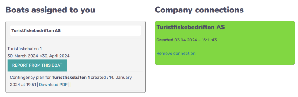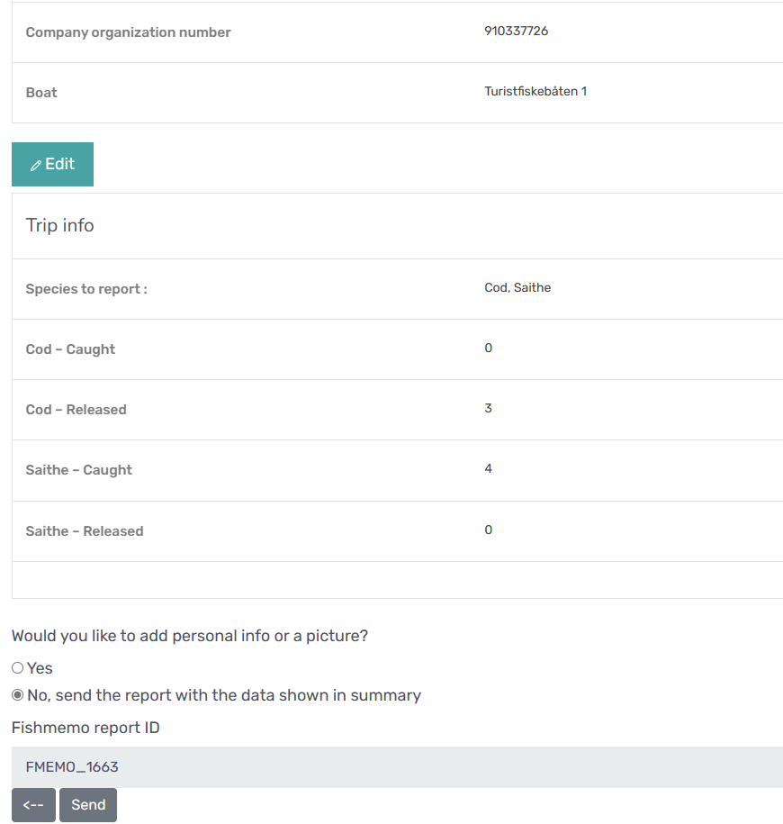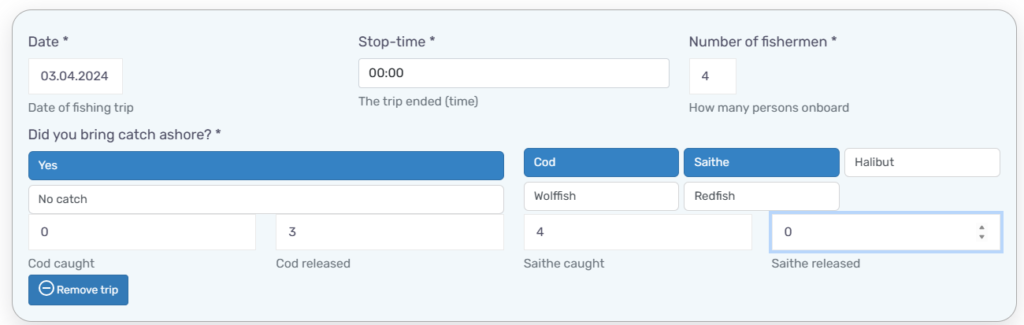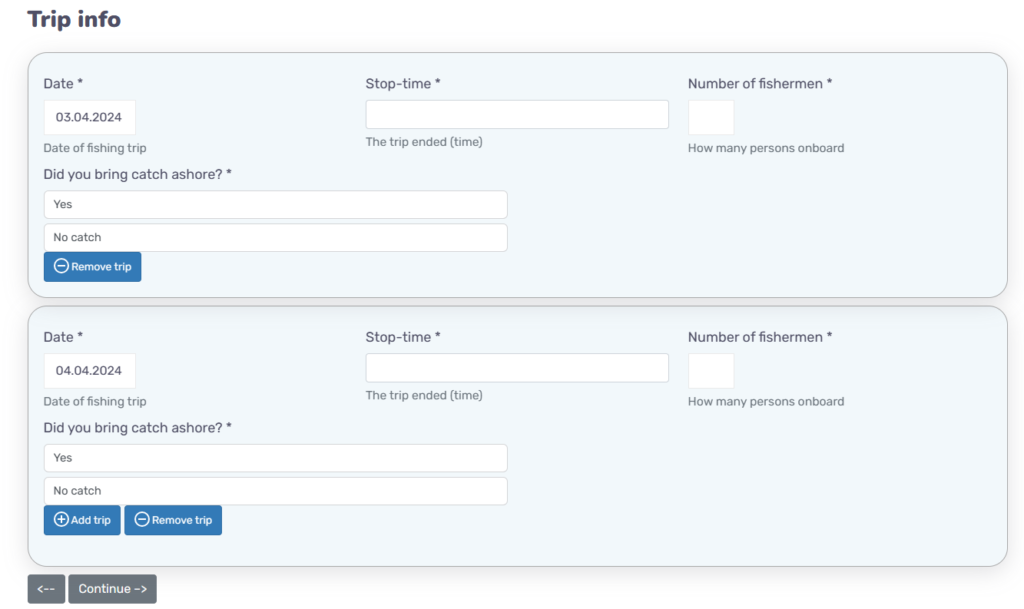 You can send multiple trips in the same report. A trip is catch for one calendar date, and each blue box represents one trip. Use “Add trip” to report from more than one day. Even “no catch”-trips requires a report.